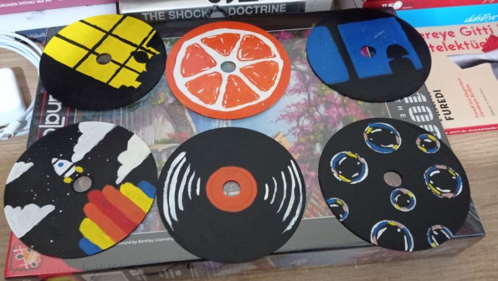 Evde artık kullanmadığımız çok cd bulunuyor, ben de geri dönüşüm ve diy işlerinden çok hoşlandığım için onları boyayarak duvar süslerine dönüştürdüm. Sanatsal kabiliyetlerim sınırlı olsa da çok keyif aldığım bir aktivite oldu.